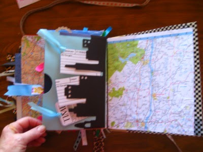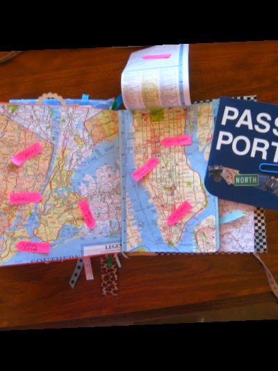 flip that up and there is the part of NY she probably knows most about..with an arrow pointing to the Twin Towers as 9/11 happened in her life time, Madison Square Gardens, Staten Island  and museums and other things, can't remember right now. I wanted something to resemble a pass port to go along with the travel theme for journaling so I made one as you see there with blank paper inside and the map there is a pocket page where the pass port slides into!
